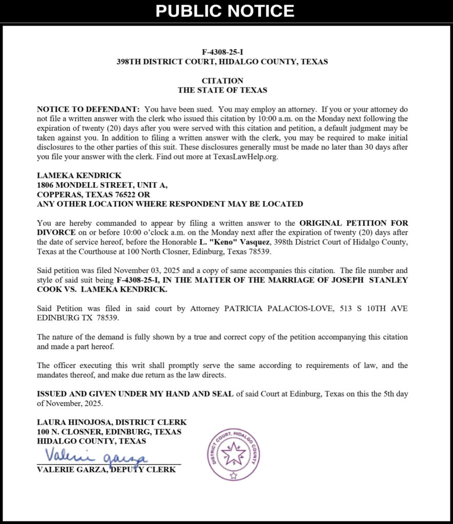 CITATION BY PUBLICATION: F-4308-25-I; Cook vs, Kendrick March 25, 2026March 25, 2026 Themercedesenterprise Public Notice Please follow and like us: